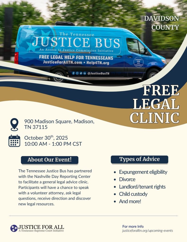 The Tennessee Justice Bus has partnered with Nashville’s Day Reporting Center / Community Resources Center to facilitate a general legal advice clinic on October 30th from 10:00 AM to 1:00 PM.
