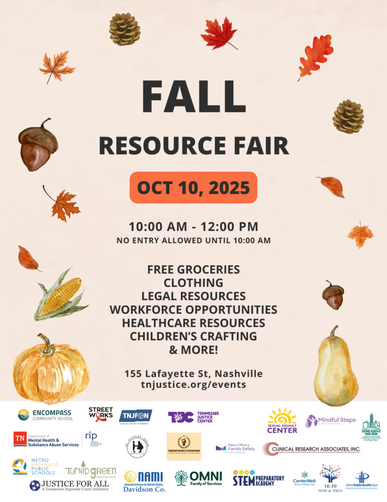 The Tennessee Justice Bus has been invited to participate in their upcoming resource fair on October 10th, 2025 from 10:00 AM – 12:00 PM. The Justice Bus will be onsite sharing and handing out legal resources and will not include a volunteer attorney. There will be additional vendors onsite to assist attendees with a variety of services.