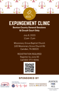 The Tennessee Justice Bus will be on-sight, partnering with West TN Legal Services and The Lifeline Peer Project on July 8th for an Expungement Clinic for Benton County.