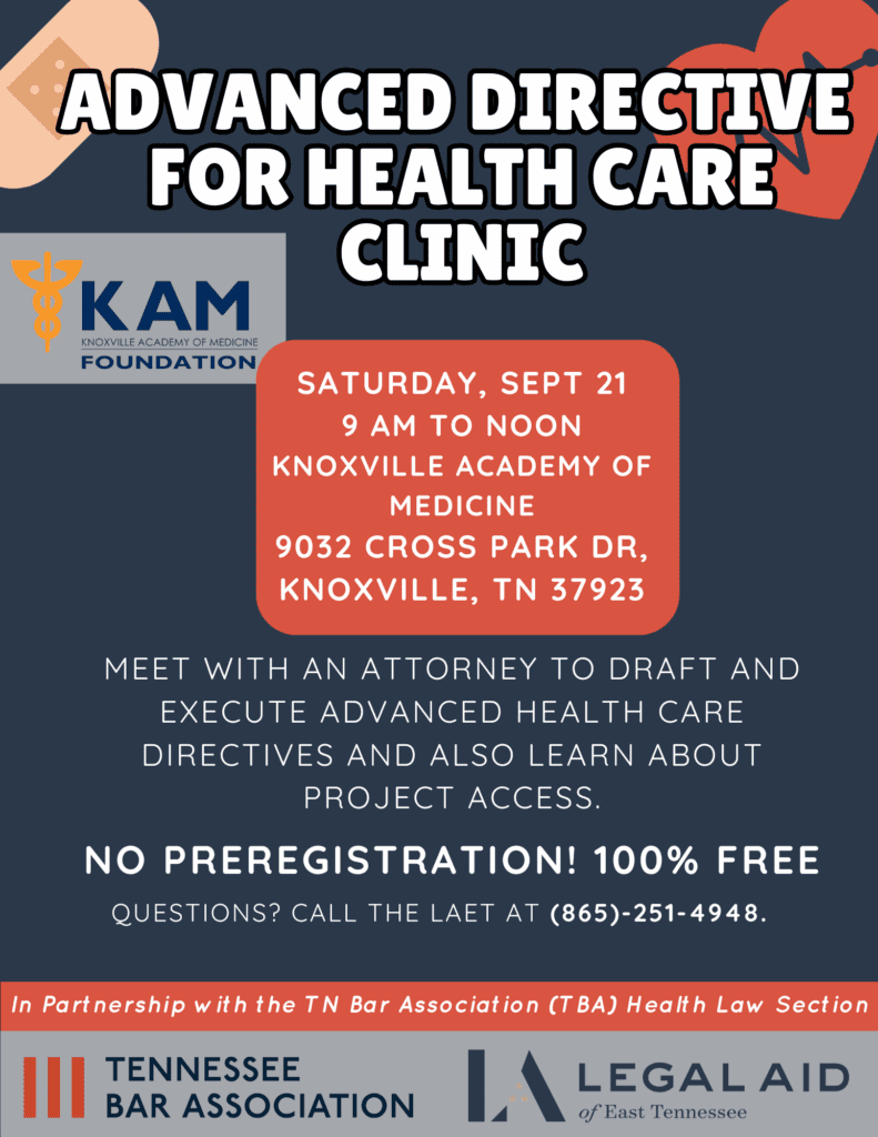 The clinic is the result of a collaboration between Legal Aid of East Tennessee (LAET), Knoxville Academy of Medicine Foundation, Knoxville Area Project Access (KAPA), Tennessee Access to Justice Commission, and volunteer lawyers from the Tennessee Bar Association’s Health Law Section and the Knoxville area.