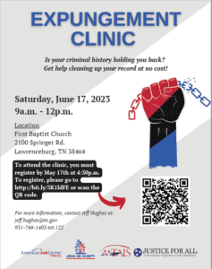 Free Expungement Clinic. The Access to Justice Commission is partnering with the American Jobs Center and the Legal Aid Society of Middle Tennessee and the Cumberlands to help support an expungement clinic in Lawrenceburg, TN. Individuals can receive assistance and information on expungements, adult education resources, and an opportunity to ask questions.