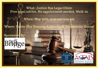 The TN Justice Bus has partnered with The Bridge West TN to host a General Legal Advice Clinic at the Housing Authority Community Center in Union City. Participants will have a chance to speak with an attorney, ask legal questions, receive direction and discover new legal resources.