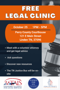 The TN Justice Bus is partnering with The Legal Aid Society of Middle Tennessee to host a General Legal Advice Clinic in Perry County on October 25th.