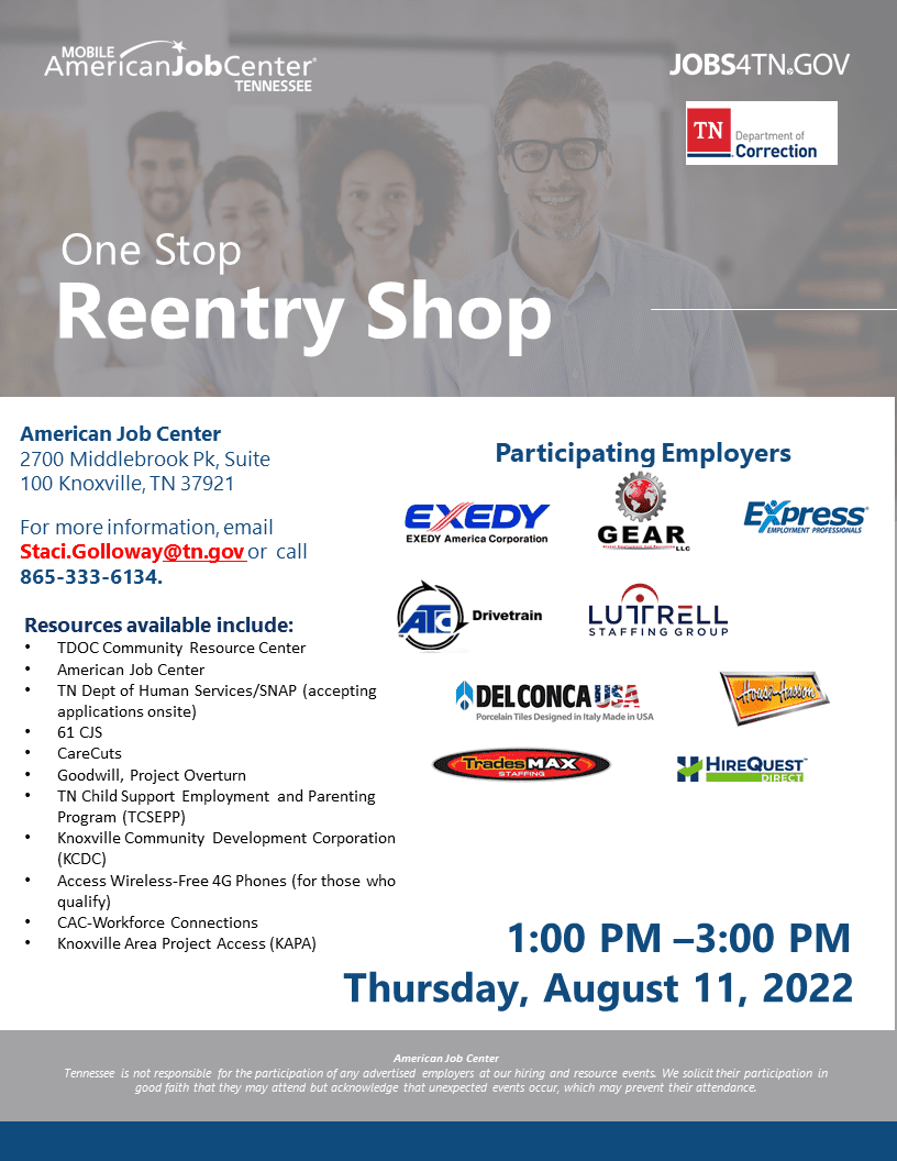 American Jobs Center Knoxville 2700 Middlebrook Pk., Suite 100, KnoxvilleThe Justice Bus will be available at the American Jobs Center to provide legal consults to people participating in the One Stop Reentry Shop.